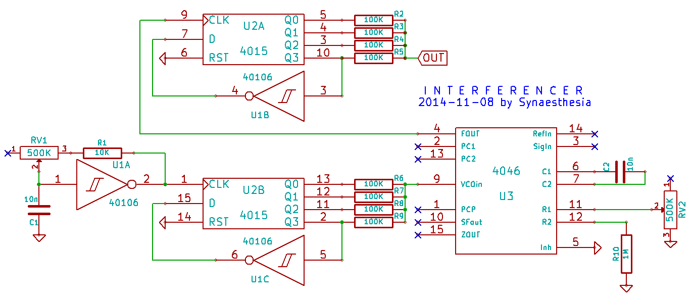 The first snippet is meant to emphasize the interference sound that you get from mixing two close frequencies. However, in the INTERFERENCER circuit, I am feeding the VCO not with one voltage, but with a fast triangle wave from a first shift register. The resulting frequency from the 4046 is then divided down by a second shift register. When tuning the triangle wave frequency against the VCO range, you get many places where a nice interference can be heard. Listen for yourself. In the first half of the recording I am only changing the triangle wave frequency. In the second half I am only changing the 4046 VCO range.