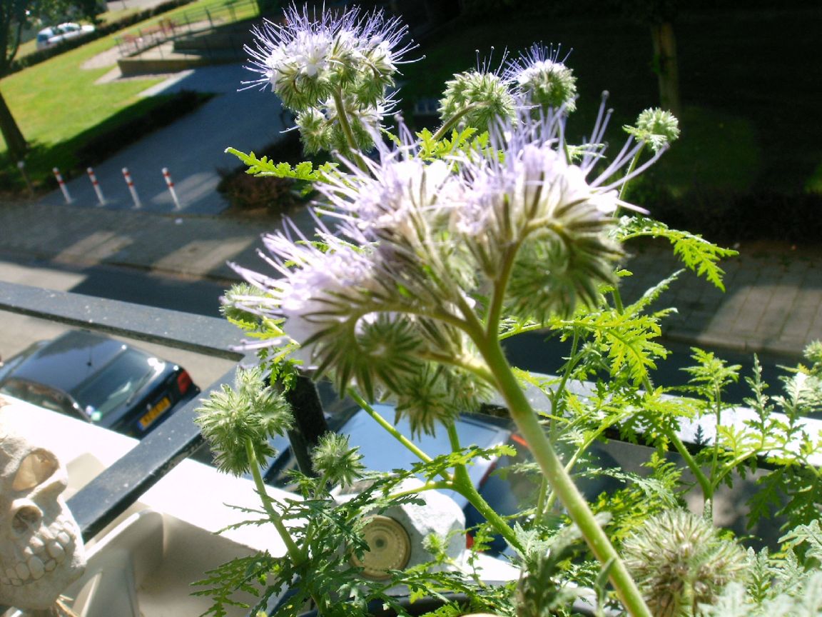 | Some more pots: the large one has the butterfly seed mix, in front of it a pot with some ivy (I had so many cuttings), the pot with the small fern and next to it a pot with a dandelion and some other weeds (got it for the bees). |