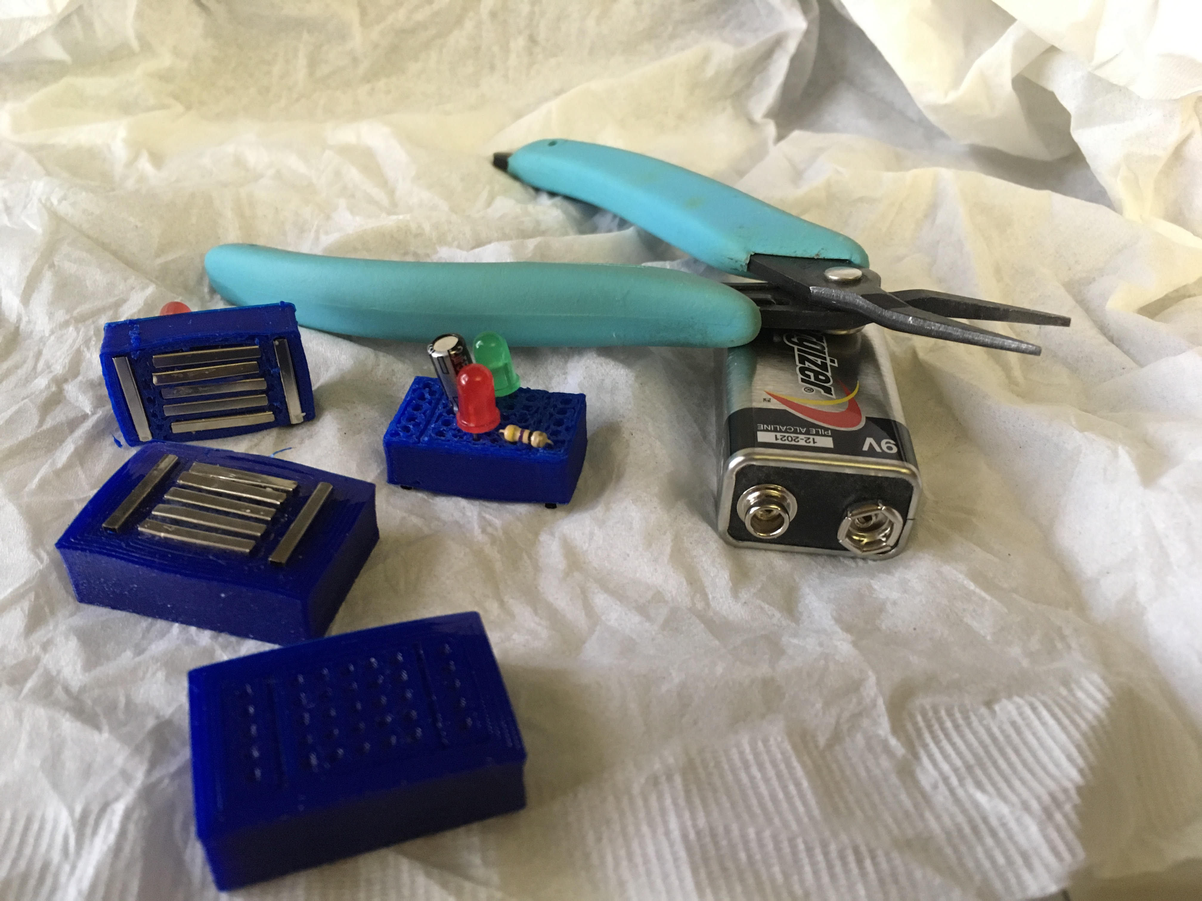 All of the electrical connections are recycled from an old breadboard. They are 5x1 positions of 0.1 inch spaced "grabbers" that provide the physical and electrical behavior of the breadboard's interior mechanism.
