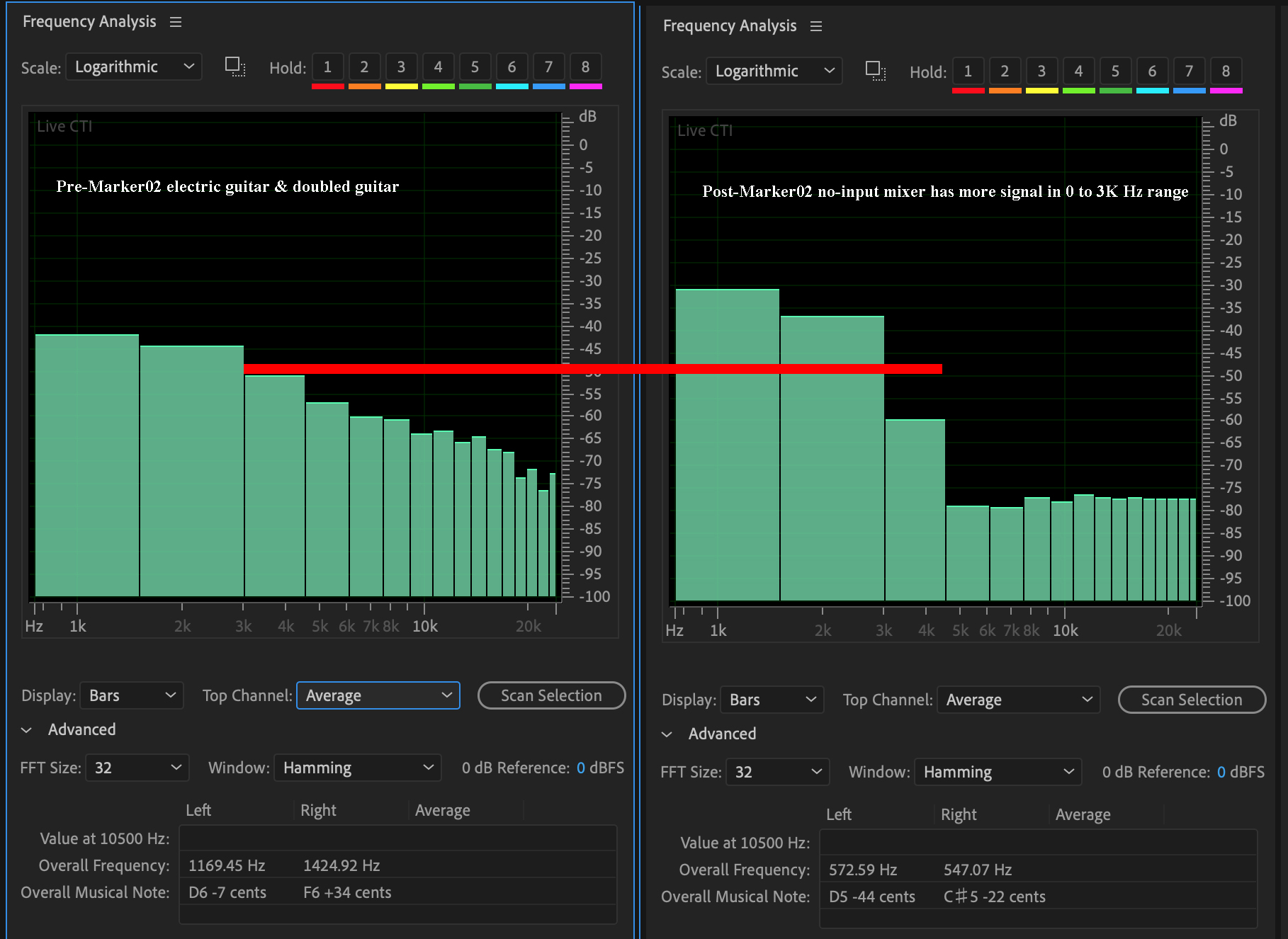 | FFT screen shot, with pre-Marker02 on the left and post-Marker02 on the right. |