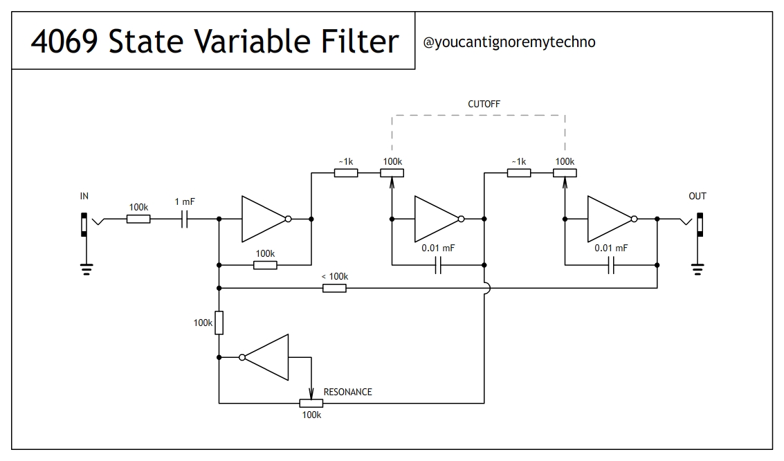 And here is the newer newer version. Almost linear resonance and a loads of it. Self oscillation and so on. This version works better with CD4069 unbuffered. Low pass bypass and hipass also available.