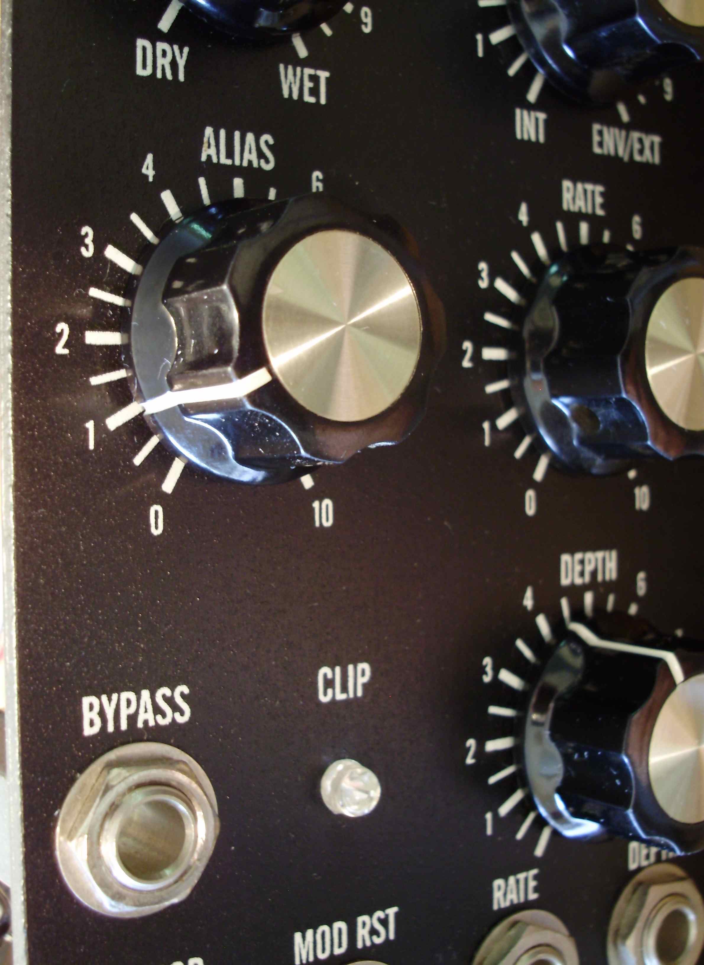 Alias knob to control the amount input aliasing, provides original unmodified function at lowest setting. This unit does not have a Bypass switch, but the Bypass jack still functions as a VCA on the wet signal.