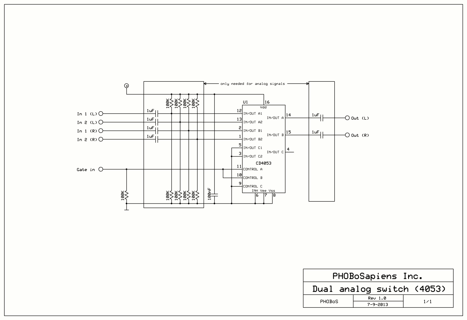 note: for the 4066 version a high gate will select input 1, for the 4053 version a high gate will select input 2. (can be changed of course)