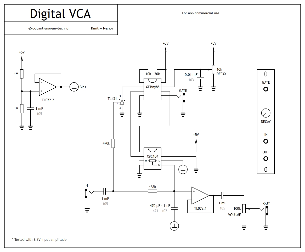 TL431 used as 2,5V comparator. In this curcuit envelope is exponentional. But if you will make inverting amp with digital pot. in feedback loop, envelope will be linear.