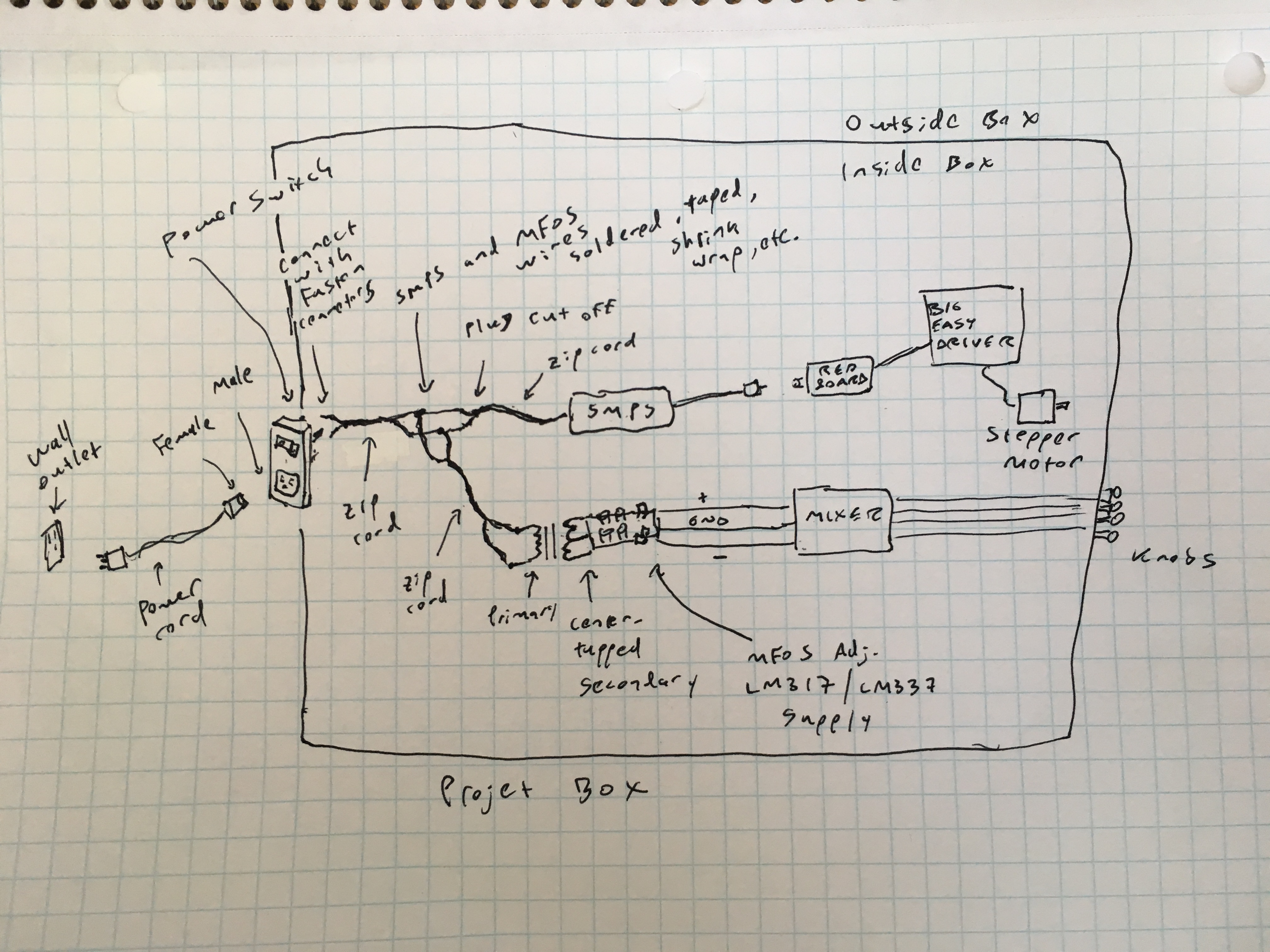 I have everything built and working; I am currently powering the Big Easy Driver with this supply https://www.amazon.com/gp/product/B073QTNF9F/ref=ppx_yo_dt_b_search_asin_title?ie=UTF8&psc=1 the RedBoard is powered via the USB of my laptop, and the mixer is powered by my bench power supply. I now want to mount everything permanently in my project box so that I have a single cord and on/off switch.