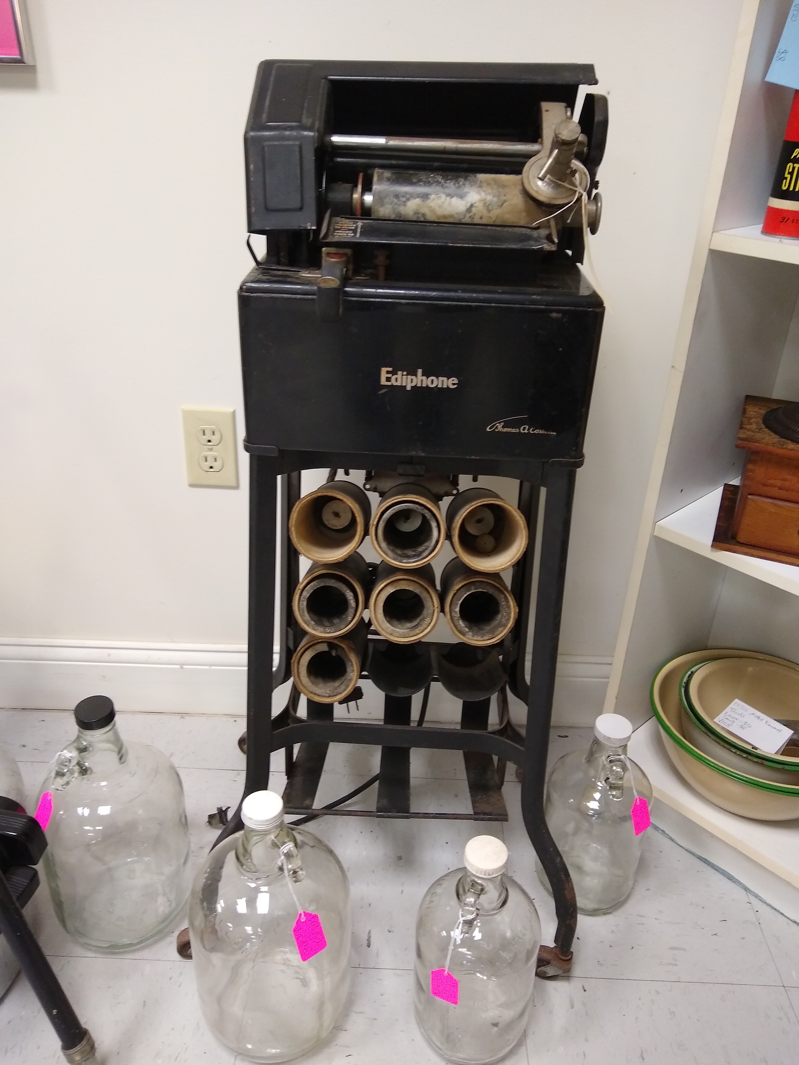 I was at an antique shop today and came across an early Ediphone. The proprietor was kind enough to let me take a photo. It's a recorder and it has a few cylinders in the storage rack.
