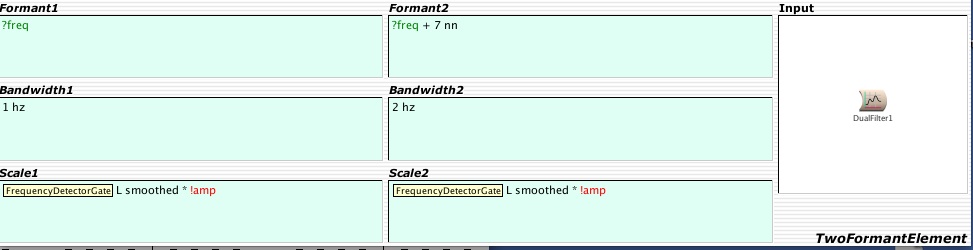 DualFilter2 is also a dual parallel two pole bandpass filter. The frequencies are the same as the other filter but the bandwidths are 1Hz and 2Hz. The amplitudes of these filters are not fixed, they are set from a smoothed envelope provided by the FrequencyDetectorGate. This amplitude of this envelope can be attenuated by midi or a Kyma gui.