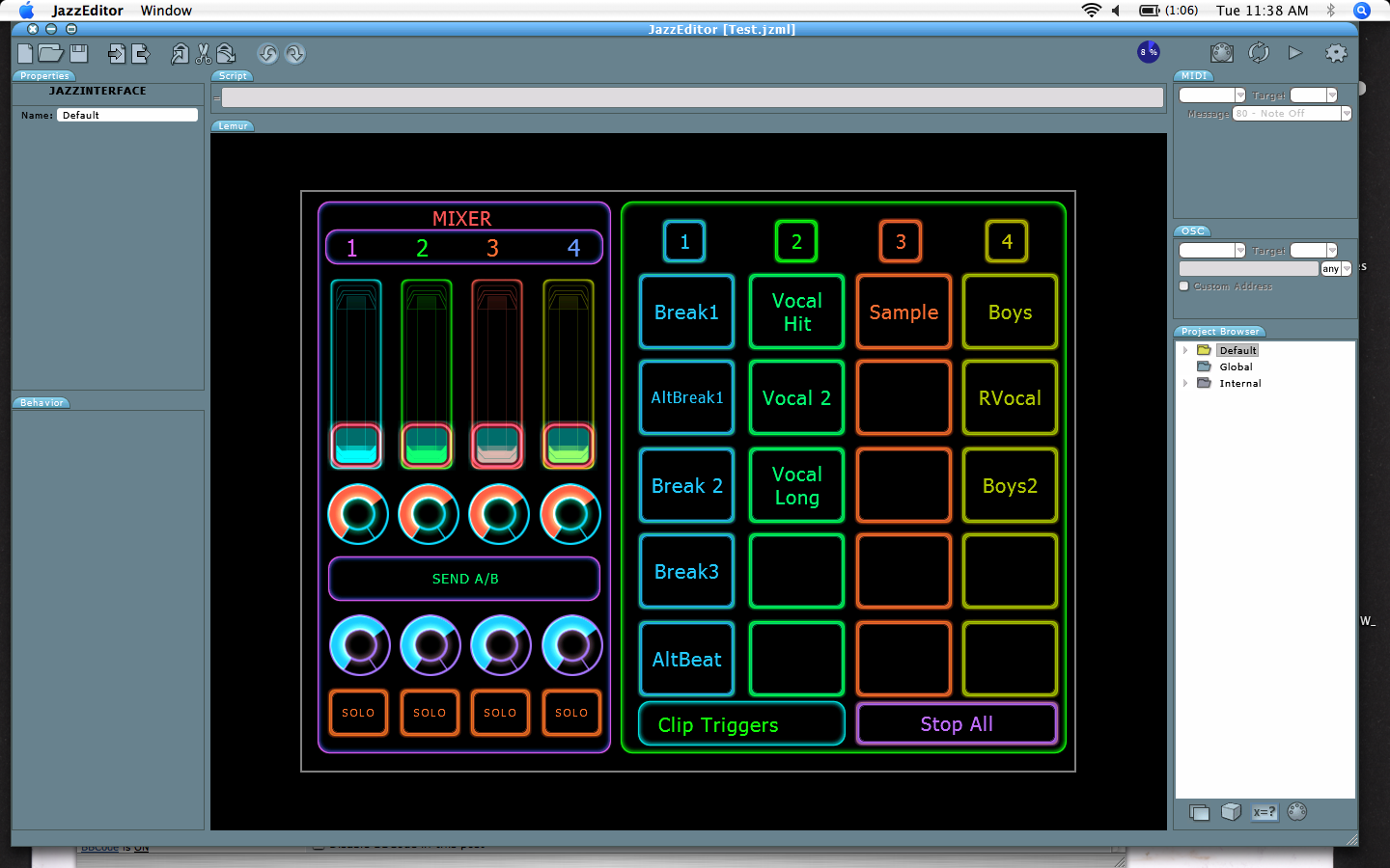 There would be a main interface or interfaces on the lemur that would display all the mapped plugins in your project, touching one of these projects would bring the plugin to the front on the screen and then the interface for that plugin would be transfered to the Lemur. Interfaces would originally be generated by code (basically just using knobs and buttons) but users could then load them into the JazzMutant editor and move things around to create the layout they require. Also as long as they then stick with the generated osc names they can map other controllers such as multiballs, sliders, faders etc. to be use instead.