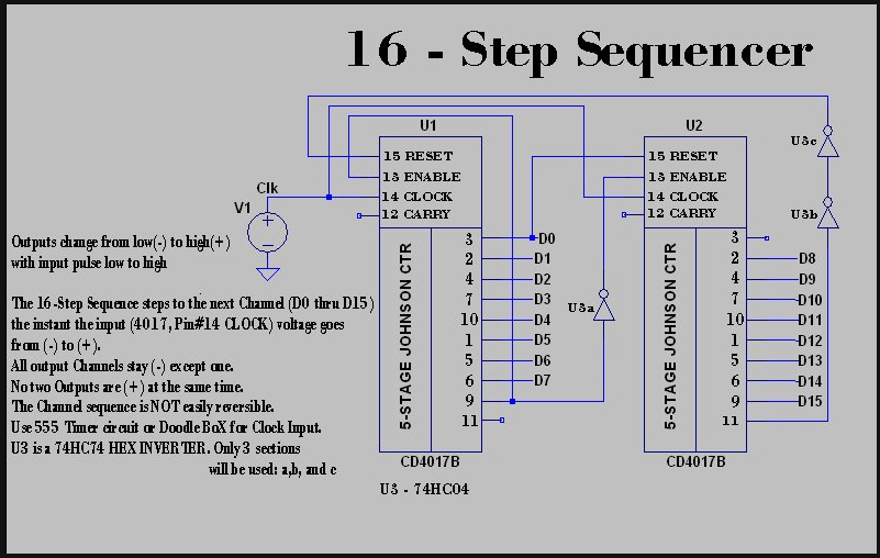 | Team Toothpaste wrote: | Hello CMOS geniuses, I was wondering if any of you have had any luck with making a 16 step sequencer from 2 4017's? A quick google search seems to suggest that this is not as easy as one might assume. Does the description in the comments of this page (suggesting the use of a 4081) make any sense to anyone?