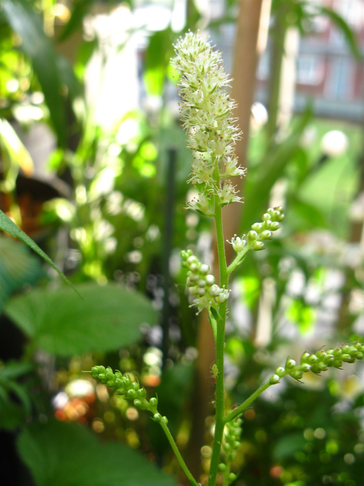 (if it flowers this year) the Monkshood. The open flowers are white though and I don't really mind it.