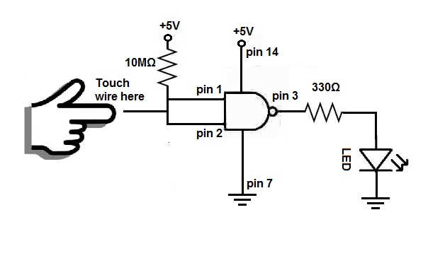 When we touch the touch wire, we are essentially acting as a resistor, creating a voltage divider circuit. Our body resistance can range anywhere from 100KΩ when dry to anywhere to about 1KΩ when wet. Either way, our body's resistance is much lower than the 10MΩ resistor. So it only a small amount of the 5V falls across our body. Doing the math, the voltage that falls across our body would be V= (5V)(100KΩ)/(100KΩ +10MΩ)≈ 0.05V, which is essentially 0 volts. The NAND gate reads this as a logic 0. (0.05V is way under half of the power supply voltage, which is 5V). So the logic level now at the inputs of the NAND gate changes to LOW (or 0). According to NAND gate logic, 2 LOWs at the input produce a HIGH logic level at the output, so the LED now powers on.