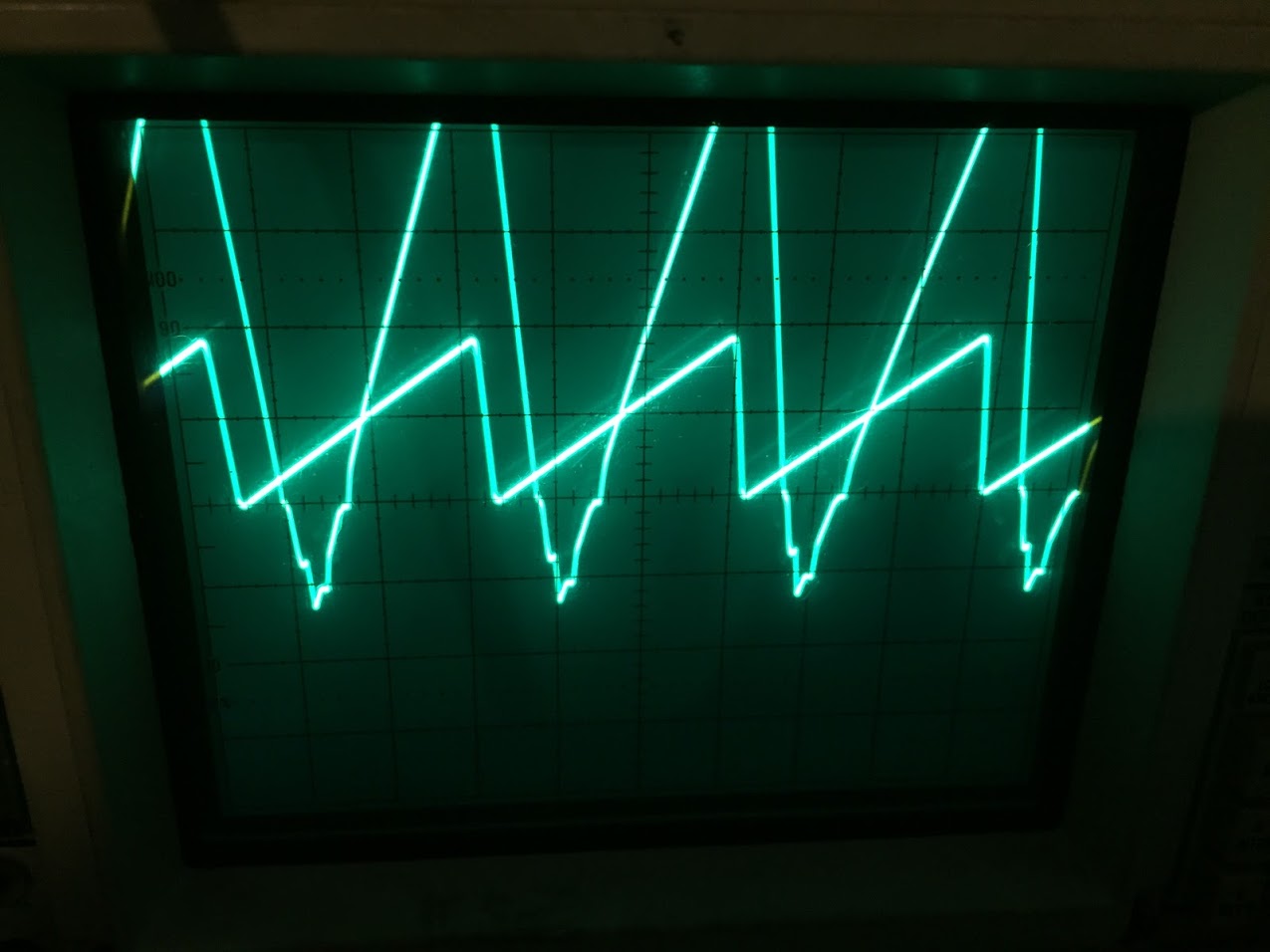 Low frequency - 2V per division. RAW going between about 1-2V. Ramp output (larger) shows the distortion around 0V. |