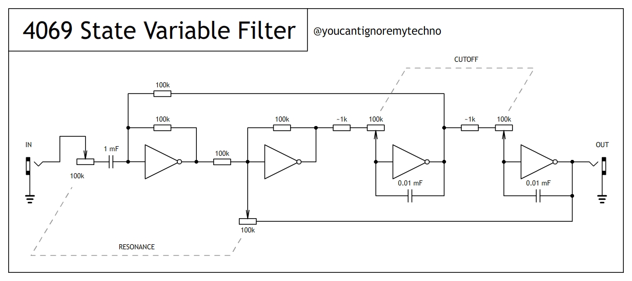 And here is the newer newer version. Almost linear resonance and a loads of it. Self oscillation and so on. This version works better with CD4069 unbuffered. Low pass bypass and hipass also available.