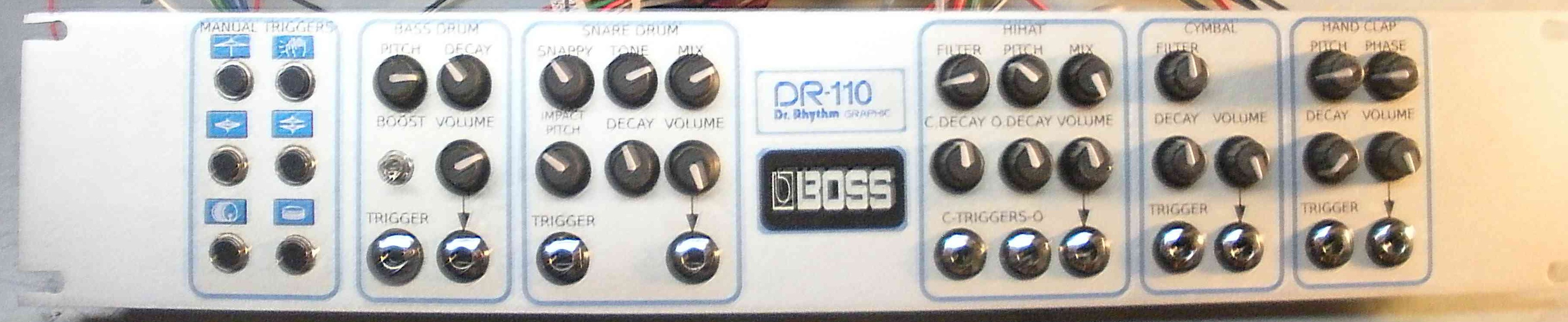 The end result is similar to a stripped down Roland 808. Now before you think that the DR110 is inferior to the 808 and it's older, bigger brothers, remember the DR110 was designed last, when the Roland engineers were more experienced and at the top of their game. The fully modded DR110 is every bit as good as the 808.....or any analog drum machine IMHO.
