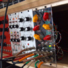 As you can see, I built mine in the Synthesizers.com format, and crammed the lot behind a four-space panel, which I screen-printed myself. It only barely fits and it took some juggling to get all of the panel hardware to fit. I almost opted for smaller knobs. I didn't have any of the Moog style knobs I usually use for my modules on hand, so I used some Rat Shack knobs we had lying around. I'll probably replace those. Though you can't see it in this pic, I mounted the PCB parallel to the front panel on some kludged standoffs. It is almost exactly the same length as the Dotcom panel is wide, so it was a close fit.