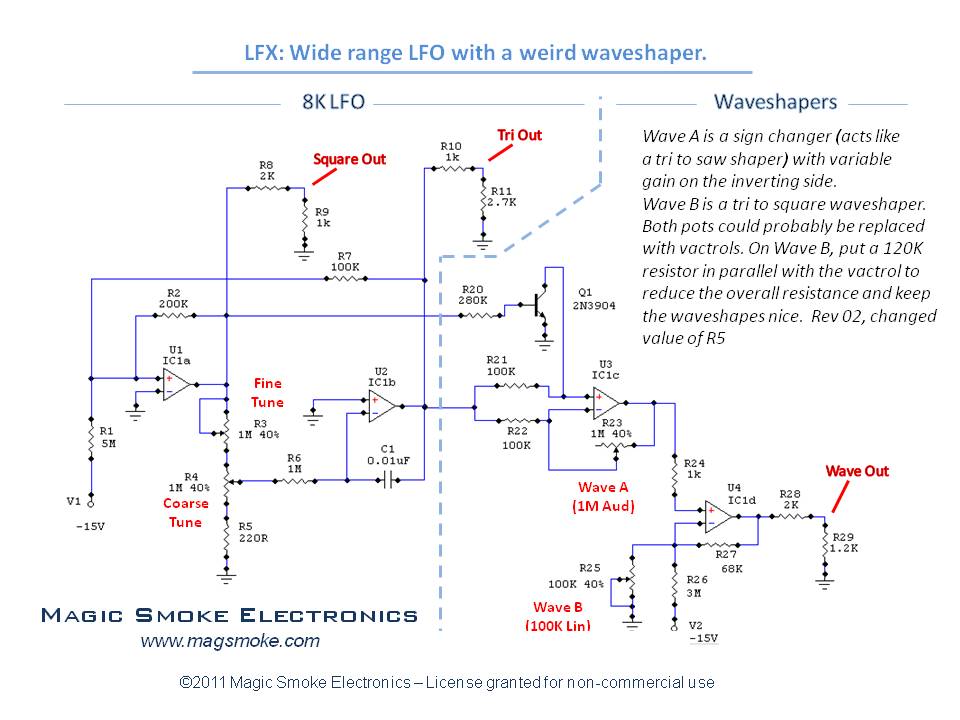 Magic Smoke LFO ,design by Tim Servo , more on this thread : http://electro-music.com/forum/topic-32372.html as he explains : Here's one of the LFOs I've cooked up recently. This runs on a +/-15V supply and puts out standard +/-5V outputs. For the most part, it's a basic triangle oscillator built around a comparator and an integrator. I wanted something with a LOT more range than the other LFOs I was finding, so I made a few tweaks and came up with a design I really liked. This one goes from 0.017Hz (1 cycle / 60 seconds) to 150Hz, or a factor of 8,800:1 (hence the name).