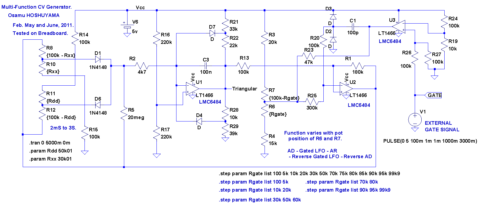 LFO by Juan Bermudez from his Book on Synthesizer construction : Nueva Genration de instrumentos musicales Electronicos which is freely available on the web in Italian