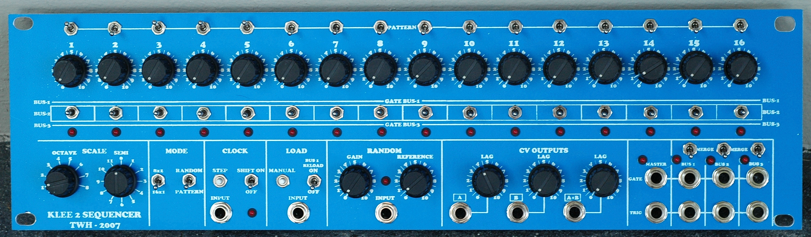 The idea consisted of adding another row of 16 pots. Each row of pots would have a selector switch - Klee pattern or "normal" one bit sequencer. The gate bus would also have this selector switch. With that method, one could switch any row of pots and the Gate Bus to process either the Klee pattern or the normal 1 bit sequencer.