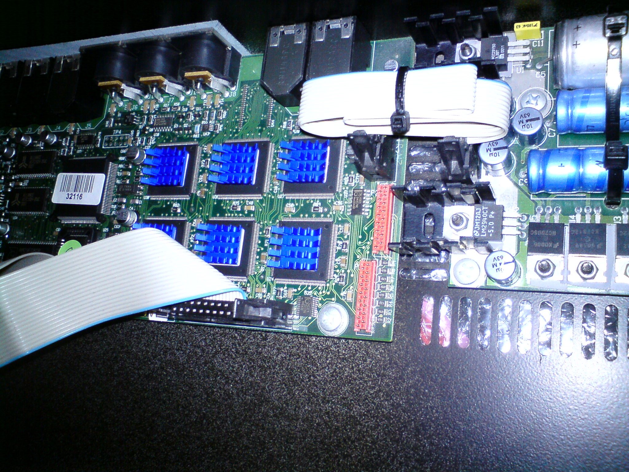 So I replaced the 300mA with a 125mA model for 230V operation [Ø6 x 32 mm 125mA Time Lag Fuse (Slo-Blo®)]. Then switched the PSU to 230V... Did some cleaning and organization under the rack... And decided to add Zalman heat sinks to the 6 120MHz DSP chips... I'm thinking about adding 1 more (bigger) heat sink to the blue power transformer to help it cool down (adhesive thermal pad needed + heat sink needed).