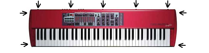 * the two screws at the front of the sides and only loosen the two with the washer (see picture) and leave these in place: they keep the hood fixed to the bottom of the synth, so you don't have to disconnect any inside cables!