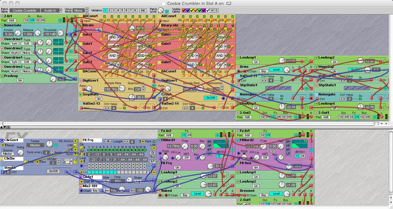 Two intriguing boxes that’s been on my wish list for a while is Biscuit by OTO Machines and the Geiger Counter by WMD. For those of you not familiar with them, they both focus on the sort of crunchy sound you get from bit reduction, but with different approaches. I tried replicating them on the G2 and came up with…well, not so satisfying results for different reasons. But I took what I think is the best pieces of both replicas and put them into one single patch that suited the G2 sound/modules and the interface better. I've also tried fine tuning the "gain stages" and overdrive circuitry. I'm quite happy with the result. It have satisfied some of my appetite for the sound of sweet, crunchy crumbles… Hope you like it!