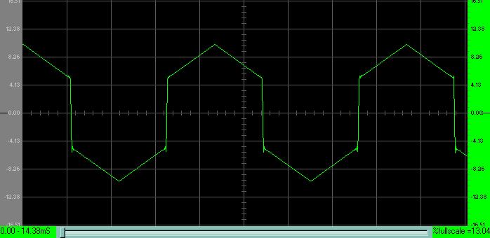 Variation 4 is an equal mix of triangle and square wave with the optional pulse phase offset value set to -32, which shifts the phase of the fundamental frequency of the square wave to be 180 degrees out of phase with the fundamental frequency of the triangle. The resulting waveform has a high amount of harmonics in relation to the fundamental, great for edgy and aggressive sounding patches... |