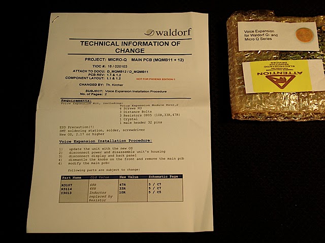 Below are service notes we found for the micro Q expansion installation procedure. We are primarily focused on the Q and XT synthesizers for the expansion, but if you want to use the proposed Rev2 Expansion in a micro Q, it will require additional parts not included with the expansion we plan to make. We offer these notes as a courtesy but I imagine since soldering is involved, you may be on your own concerning warranty matters using this expansion in a micro Q. The prototype module does work with a microQ - more details about the parts need to be figured out.