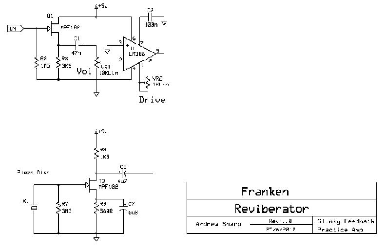 The piezo pick-up circuit is as above minus the 220K output resistor to ground, Just the 4u7 to a 100Klin variable resistor and into another 4u7 back to a point on the amp. But which point?