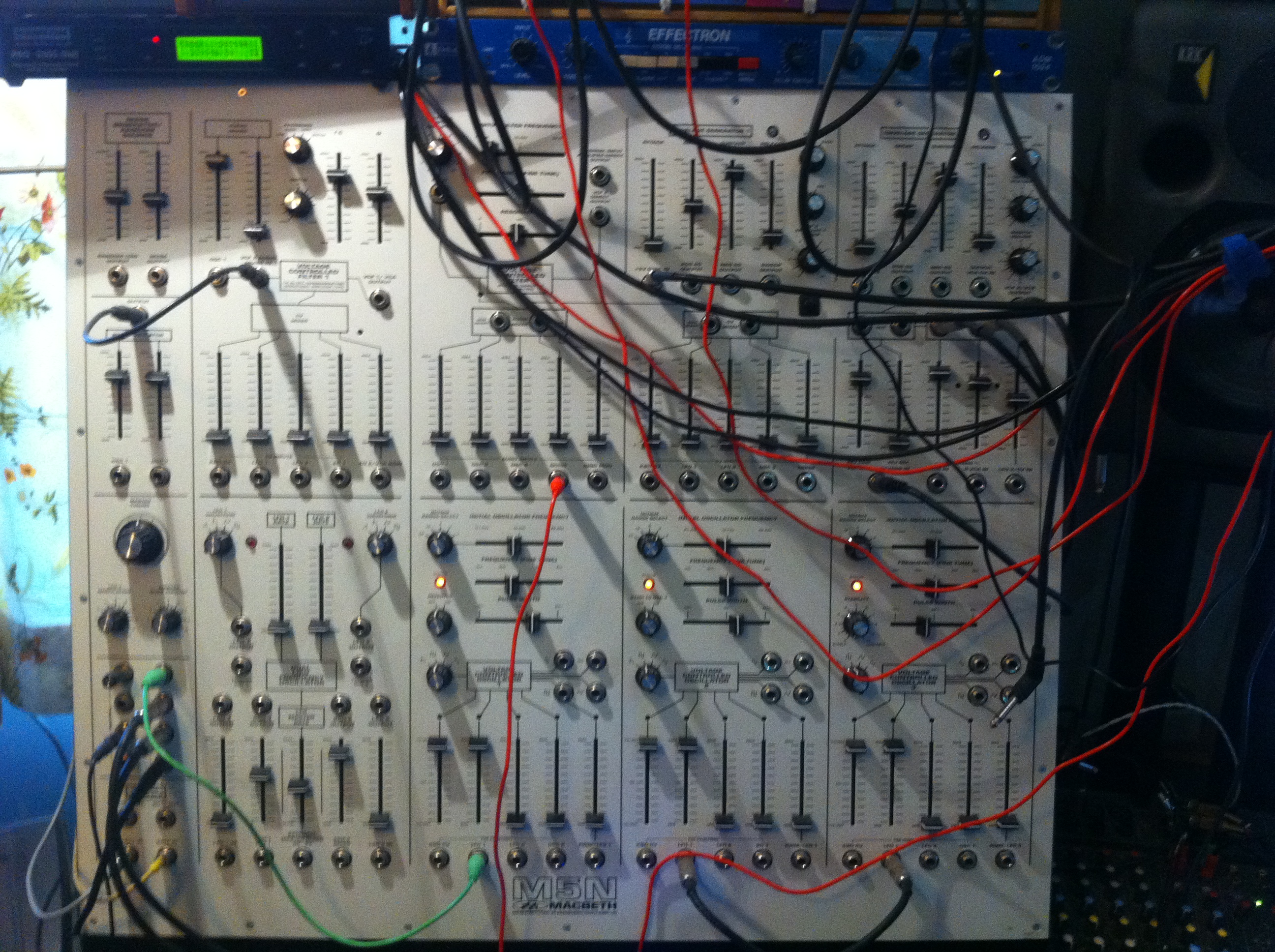 AM3030 VCOs, a Baby 10 sequencer, Moog CV351 and CP251, Kenton pro-2000, and Moogerfoogers.