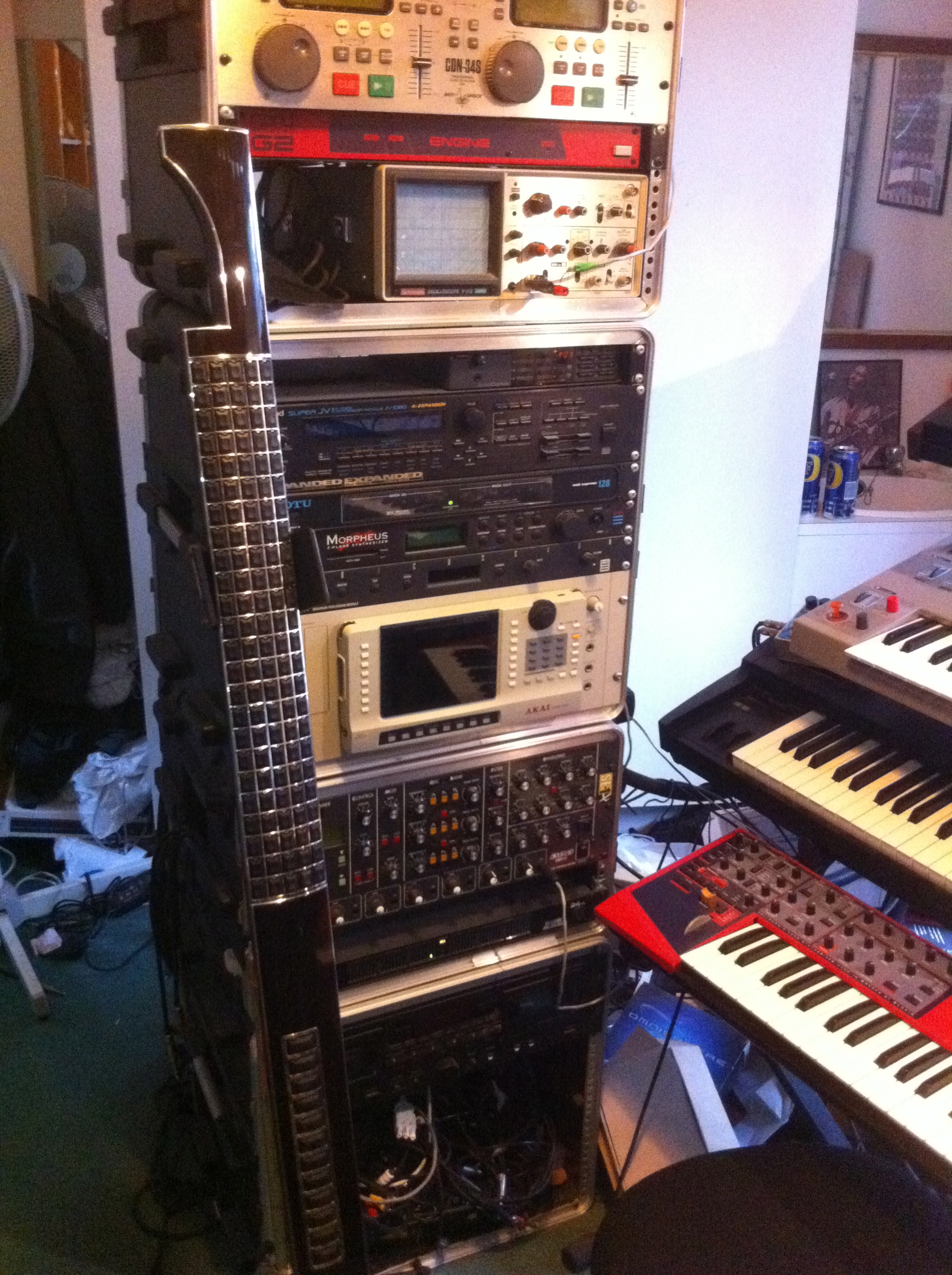 Eigenharp Alpha, and a rack with a Nord G2 Engine, Roland JV-1080, EMU Morpheus, Procussion, Akai S-6000 sampler, Studio Electronics SE-1X, MOTU 24i/o