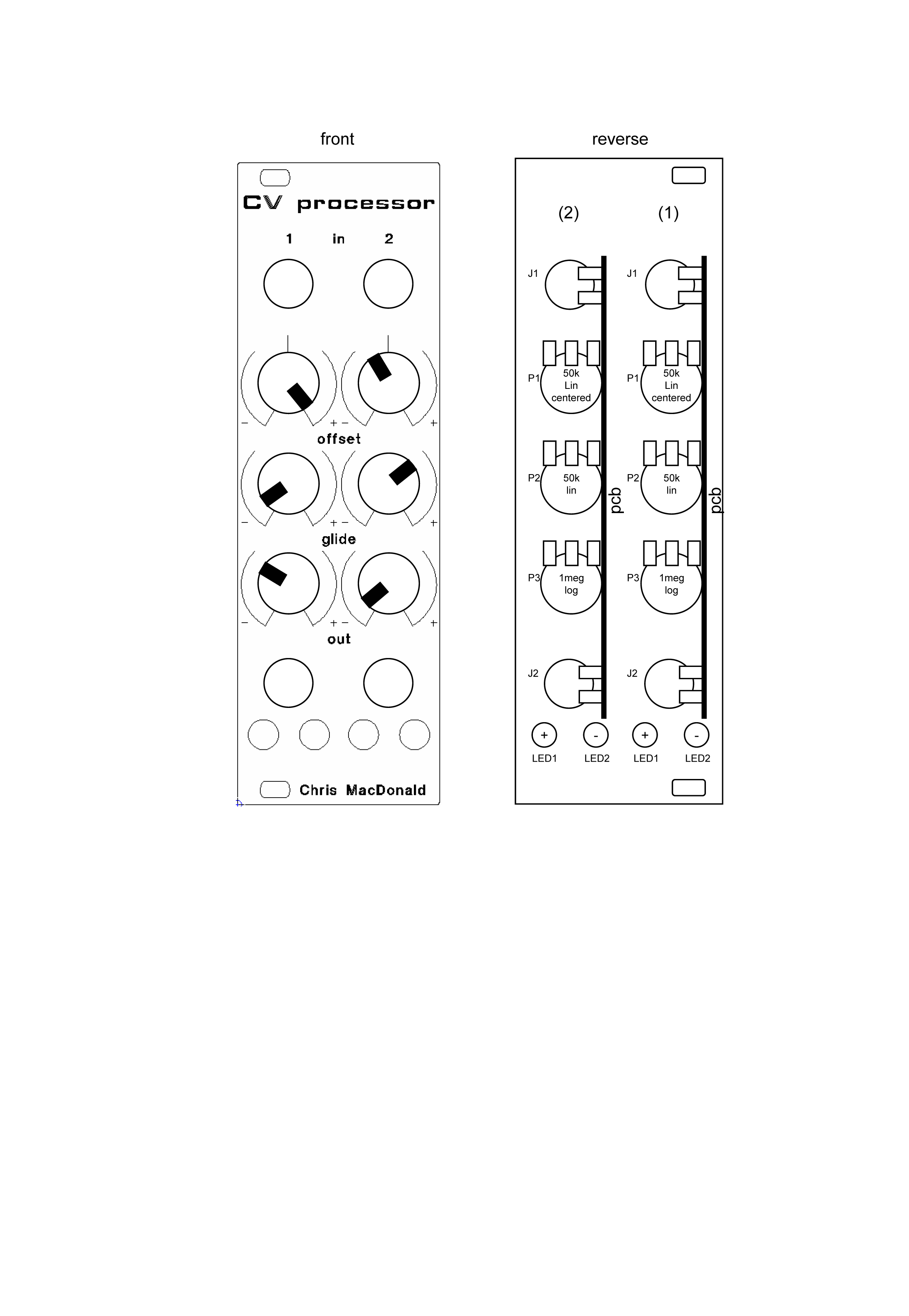 The CD processor is designed to give Buchlidian type processing for control voltages. Two channels, both with manual +/-processing, offset & glide controls. This circuit was originally based on a Chris MacDonald design modified by Peter Grenader. Besides some minor changes i incorporated a lag pot, a trimmer for calibration of a center taped pot (+/-processing) and there's a resistor missing in the original schematic to bring the LEDs to live.
