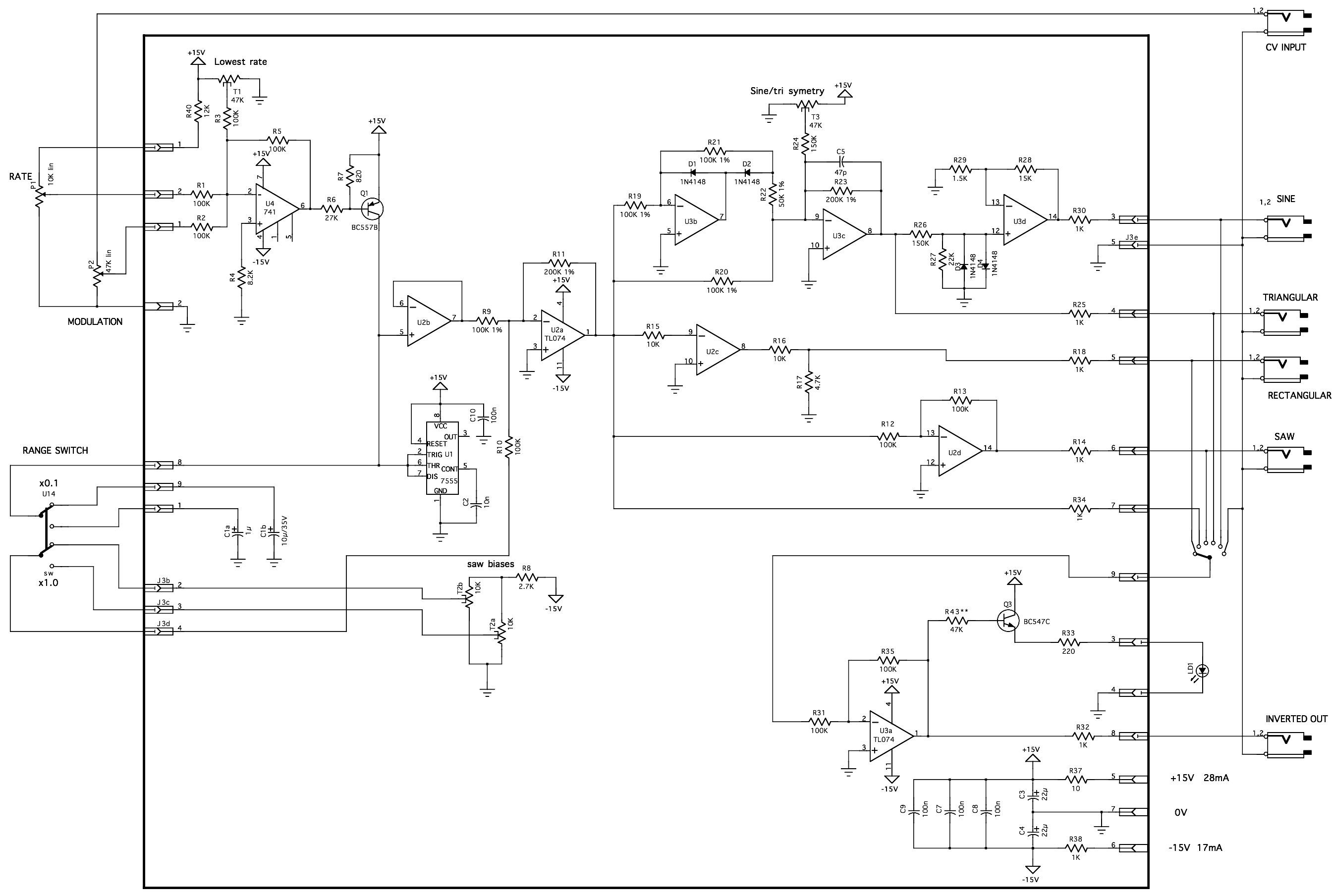 Magic Smoke LFO ,design by Tim Servo , more on this thread : http://electro-music.com/forum/topic-32372.html as he explains : Here's one of the LFOs I've cooked up recently. This runs on a +/-15V supply and puts out standard +/-5V outputs. For the most part, it's a basic triangle oscillator built around a comparator and an integrator. I wanted something with a LOT more range than the other LFOs I was finding, so I made a few tweaks and came up with a design I really liked. This one goes from 0.017Hz (1 cycle / 60 seconds) to 150Hz, or a factor of 8,800:1 (hence the name).
