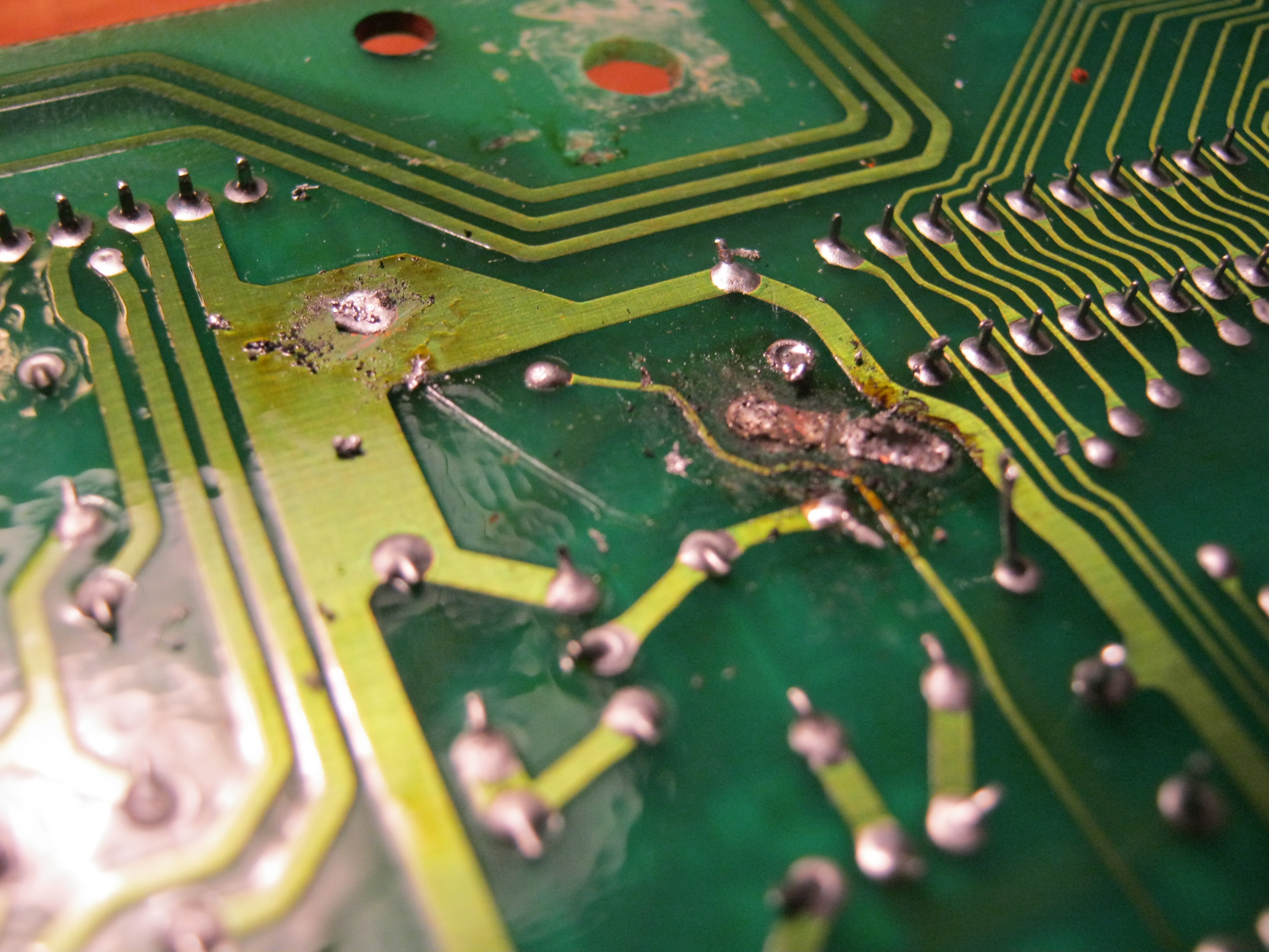 You need to clean up the backside of the PCB. Use 1t least 90% alcohol and an Xacto to scrape off all that gunk.