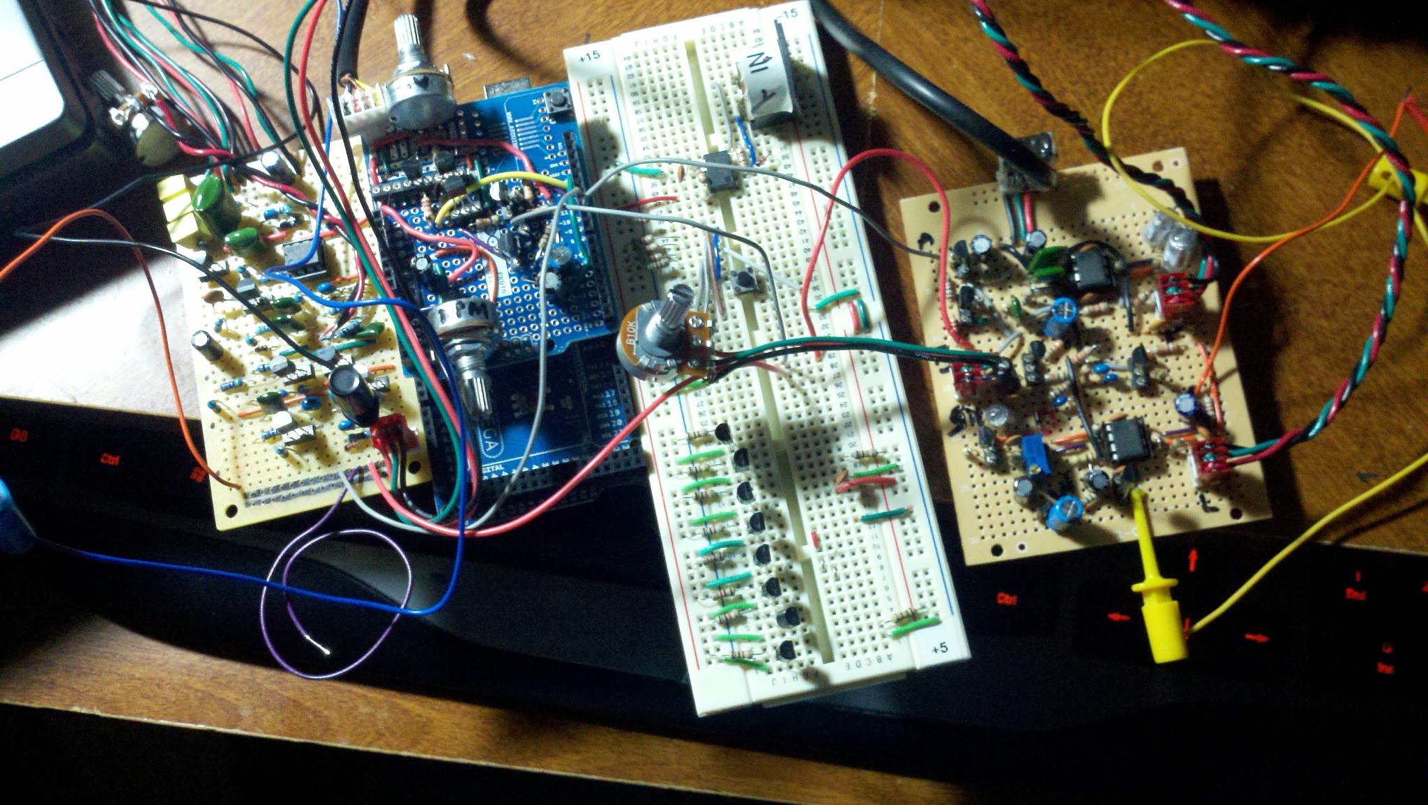 Playing around with a more complex sequence coming out of the Arduino, I found that it sounded interesting if I jumped the input level of the bass drum alternately to over drive it...