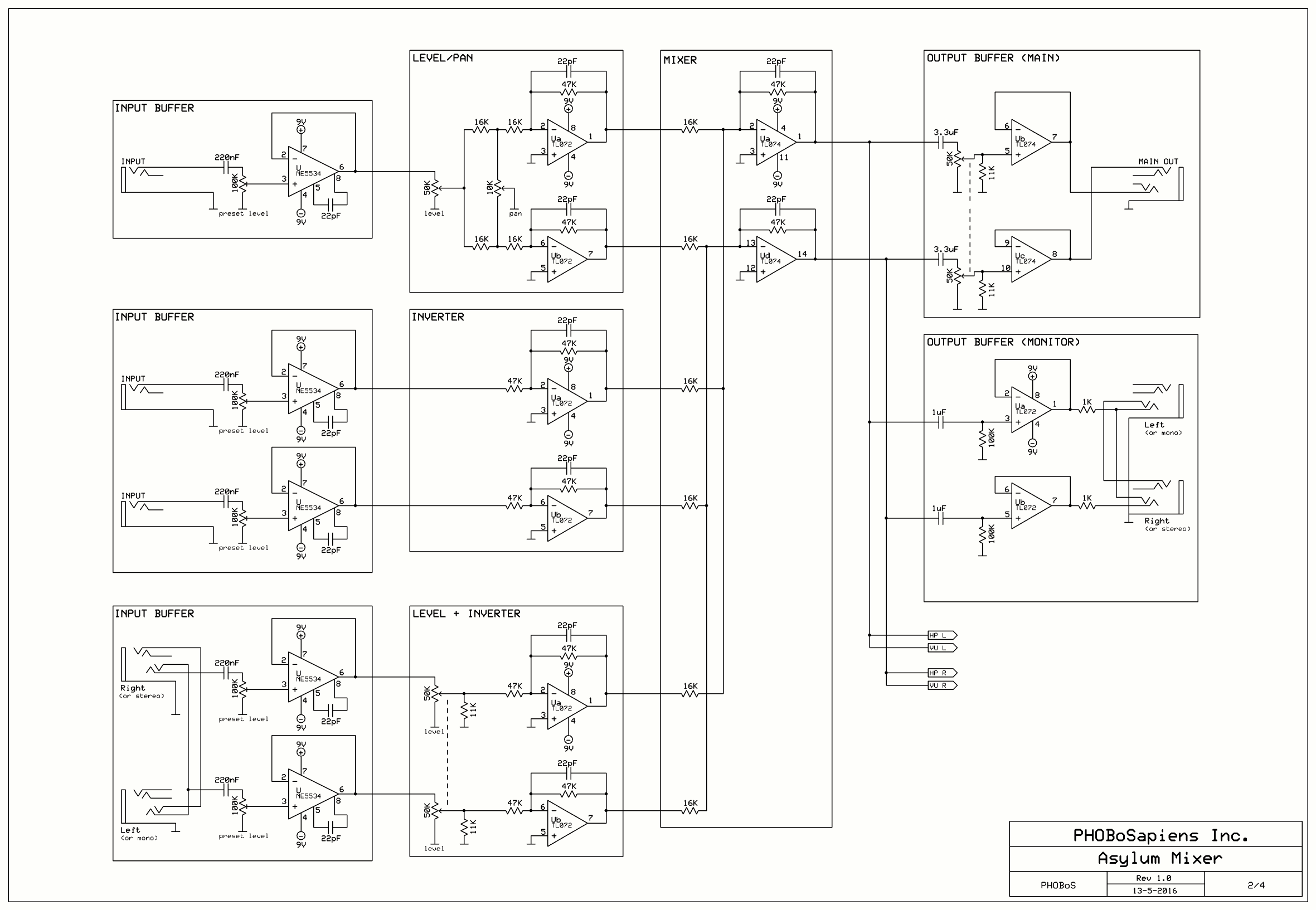 The level/panning control inverts the signal which is needed for the summing mixer so for the other 3 channels I added an inverting