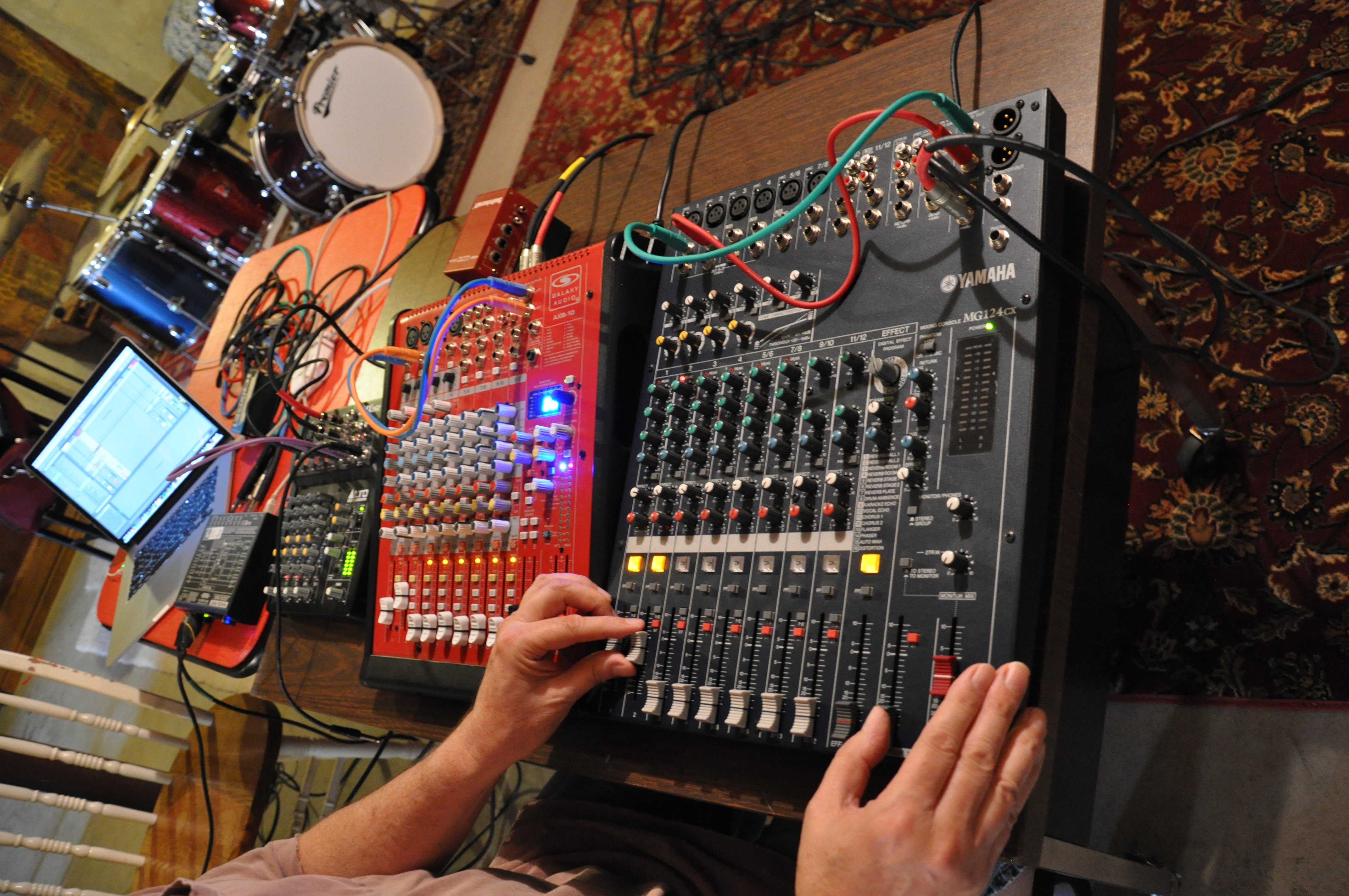 Jeremy played and Aria Thor Sound 400 electric guitar with a bunch of FX kick boxes bolted to a board, and I played my 3 zero-input mixers with no software processing. We used an assortment of 4 microphones, 3 at the amplifiers and one across the room, to record the session at a sampling rate of 48k. Photos below by Linda Parson.