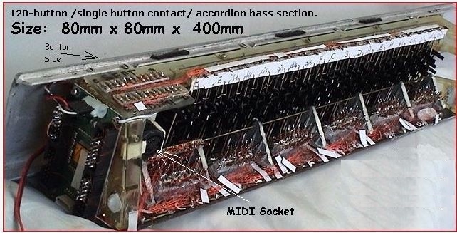 I already converted a 120-button accordion bass (bass section only) to MIDI for it. It was a hell of work, for I had to combine and solder all its chords manually via some 200 signal diodes so, that each button activates only one soft contact. The buttons now work far lighter than the buttons of a normal accordion bass. - Here's a picture of the 120 button accordion bass conversion to MIDI: