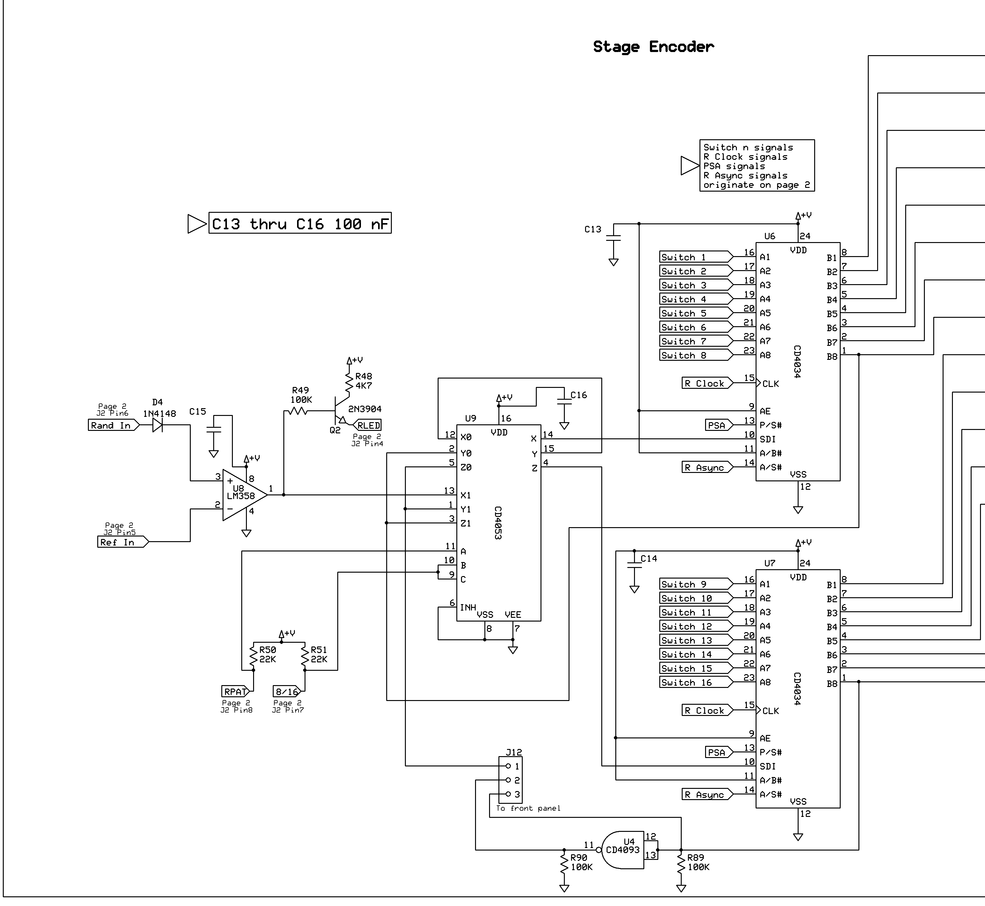 I believe you right, with only 1 bit set, it would "walk" across the shift registers like a normal seq. I guess I had in mind to drive the 4 inputs of the CD4514 1x16 decoder with a small PIC. I could then easily go back/forth, set number of steps, preset arpeggios, etc. I have built several sequencers in the past (and bought a lot of pots and switches) and thought I could use the Klee as a universal test bed for future ideas, especially since the Klee has the nice octave and semi switching. With the pots, summing amps, and LEDs, always attached to the bus, I could simply plug in a 16 bit ribbon cable to the 2nd position of the multiplexer and give it a test.