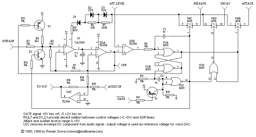 Polysynth's envelope generator by Roman Sowa as he describes it in his page : http://membres.multimania.fr/romcio/poly/adsr.html Envelope generator in my Polysynth is rather typical and as simple as I could make it. All voltage controlled.