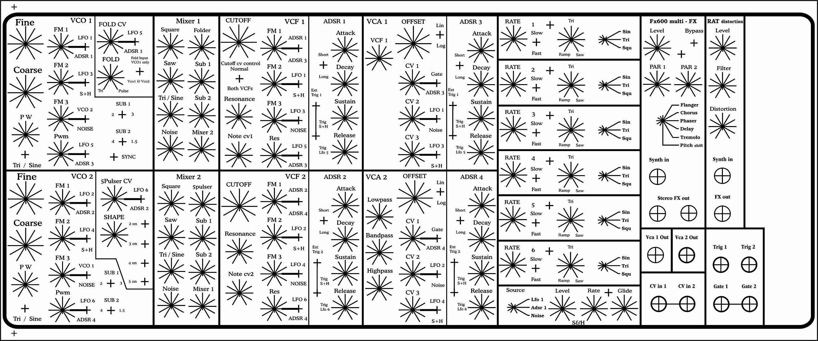 I was scanning over the layout and it dawned on me i'd forgotten glide/ portamento on the vco's , fixed now , i've considered a few circuits for the space at the right end of the panel and i think im drawn to ken stones burst generator circuit for a bit of spicey trigger action on the ADSR's & probly through an attenuator to the vco cv in's as well.