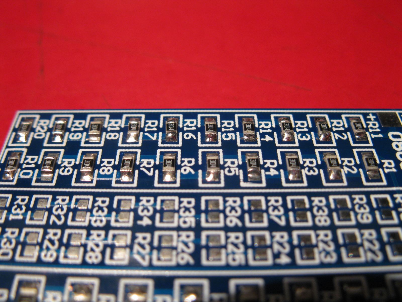 The first 9 1206 resistors are soldered. I have to admit it was already a bit more difficult than I had expected (any tips on