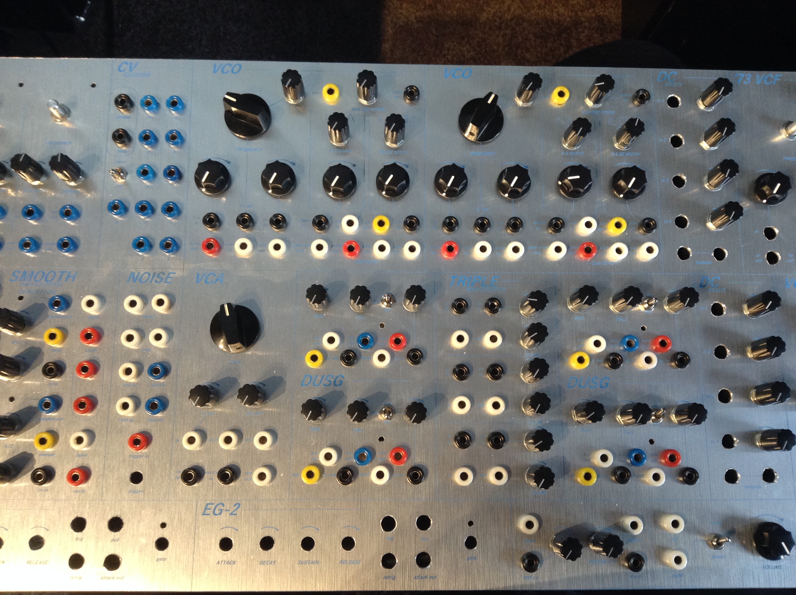 I've started mounting all the pots and jacks on the front panel. I've decided to hold off on buying the buchla style knobs for now simply because they are 4x as expensive as your average knob. So, for now I have some different davies clones and mxr knobs on there, and they actually look pretty nice! They'll definitely do for now.
